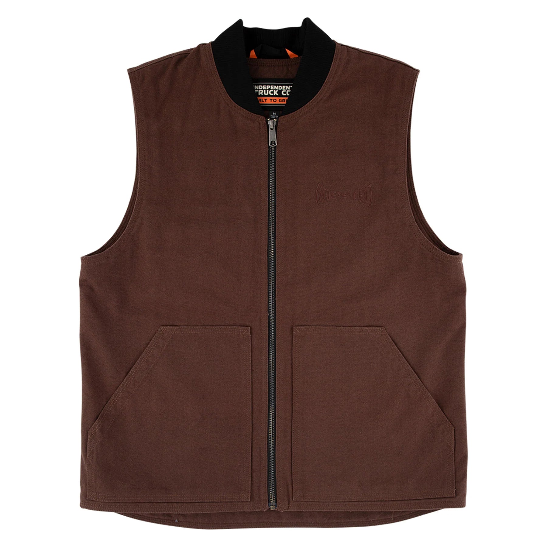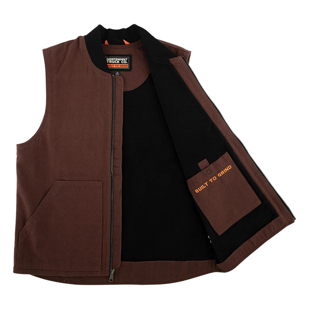 The Independent Built To Grind custom, regular fit, heavyweight 12 oz. cotton canvas, work vest features soft fleece interior, YKK front zipper, patch hand pockets, 2 interior stash pockets, ribbing at collar, woven sewn on labels.