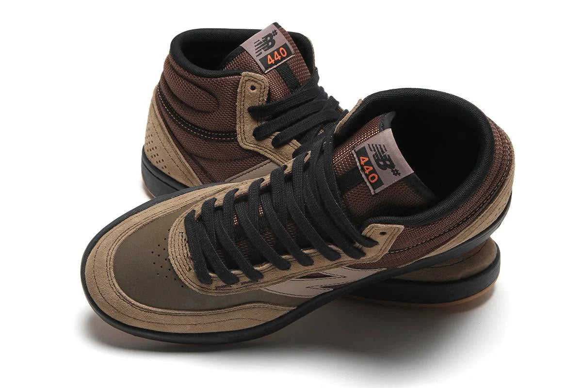 Enjoy a high top skate shoe with the 440 V2 shoes from New Balance Numeric, arriving in a Rich Oak brown with green details and a black rubber cupsole. The reinforced suede upper ensures durability, while mesh panels provide breathable comfort. The comfortable feel is furthered by the cushioned ABZORB midsole.